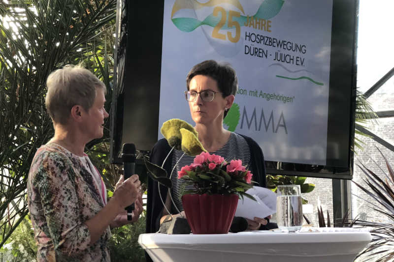 Es war bewegend, die persönlichen Worte und Erfahrungen der Ehrenamtler zu hören, die fachliche Einordnung durch die Profis und vor allem auch zu spüren, wo es den Menschen noch fehlt: Öffentlichkeit und eine Enttabuisierung des Sterbens ist ein wichtiger Schritt, vor allem aber müssen Strukturen geschaffen werden. „Sterbenleben“ heißt die Festschrift nicht ohne Grund. Viele Impulse habe ich während dieser Jubiläumsveranstaltung in der Blumenhalle des Brückenkopf-Park Jülich gGmbH bekommen. Gerne mache ich mich zur Botschafterin für diese gute Sache im Düsseldorfer Landtag.