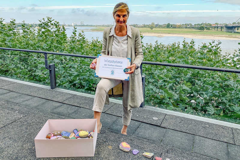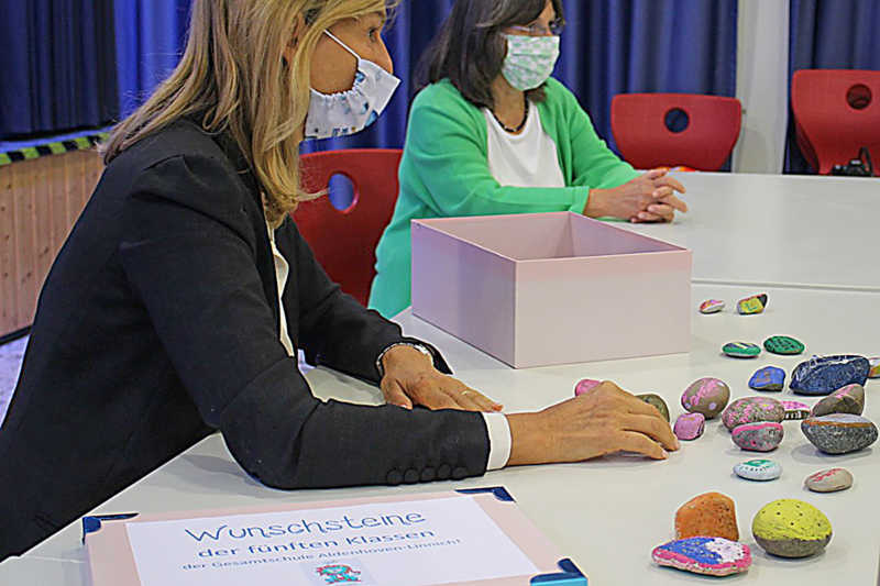 Es sind so schöne kreative Steine entstanden, manche künstlerisch bemalt, andere nur mit einem besonders wichtigen Wort versehen. Das Gepräch mit den Klassensprechern der 5. Klassen, ihrer Lehrerin Frau Sommer und der Schulleiterin Petra Cousin hat mir sehr viel Freude gemacht. Die Wünsche der Schüler beschäftigen sich mit Themen aus dem Schulalltag, der Klassengemeinschaft und Freundschaft, dem Wunsch nach guten Noten in der Zukunft und Akzeptanz. Vor allem wünschen sich die Kinder Gesundheit für sich, Freunde und Familie, und dass die Corona-Pandemie endlich zu Ende ist.