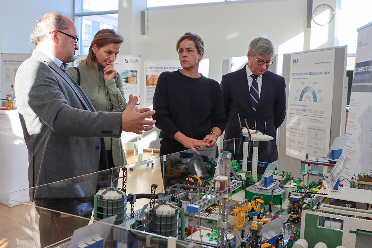 Wirtschaftsministerin Neubaur interessierten auch die Projekte und Aufgaben des Projektträgers PTJ’s. Prof. Peter Wasserscheid stellte das Wasserstoffcluster vor – unter anderem anhand der anschaulichen Lego-Landschaft, an der ich mich gemeinsam mit Mona Neubaur begeistern konnte. Sofort haben wir überlegt, welches Projekt wir dort noch aufbauen würden. Ich persönlich würde das Linnicher Versorgungsunternehmen Gelsenwasser platzieren, wo die alten Gasnetze mit grünem Wasserstoff gefüllt werden und zeigt, ein Thema „Wasserstoff im Netz“ möglich ist.