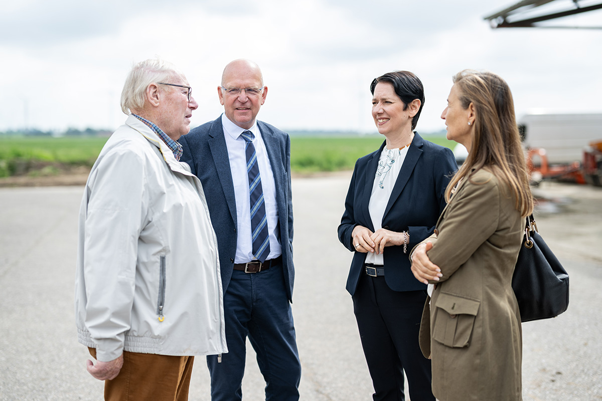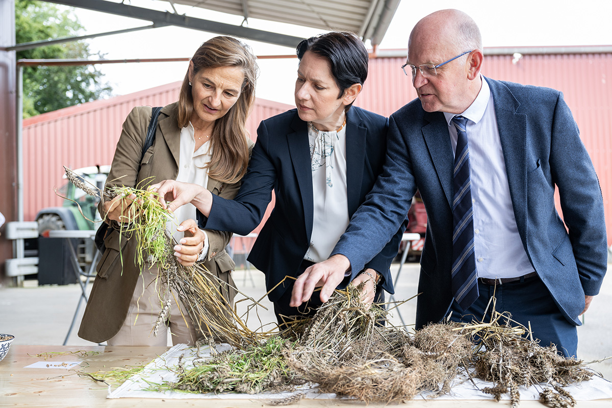 Um sich ein Bild von der regional schwierigen Situation vieler landwirtschaftlicher Betriebe zu machen und über vorläufige Ernteergebnisse zu berichten, hat Landwirtschafts- und Verbraucherschutzministerin Silke Gorißen gemeinsam mit dem Präsidenten der Landwirtschaftskammer NRW, Karl Werring, und Landwirten der Region, das Gut Marienfeld in Titz besucht. Das Gut ist ein alteingesessener Ackerbaubetrieb im Kreis Düren.