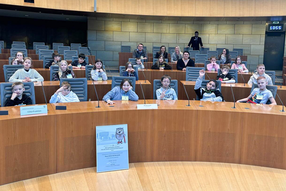 Landtagspräsident André Kuper gratulierte und betonte: „Mir ist es wichtig, dass sich schon unsere jüngsten Bürgerinnen und Bürger auf kreative und spielerische Weise mit dem Landtag und der parlamentarischen Demokratie beschäftigen.“